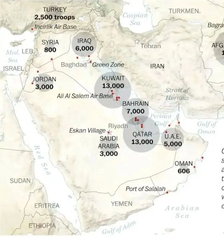 Военные базы США стали основной целью иранских атак. Карта показывает количество контингента и их расположение в регионе