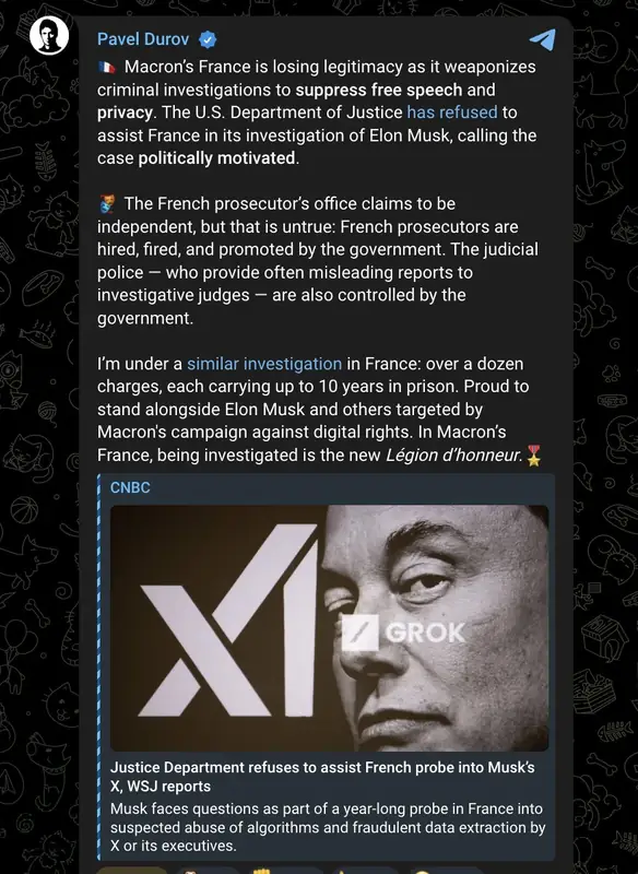 Основатель Telegram Павел Дуров заявил, что Франция под руководством Эммануэля Макрона «теряет легитимность», поскольку использует уголовные расследования для подавления свободы слова и неприкосновенности частной жизни.