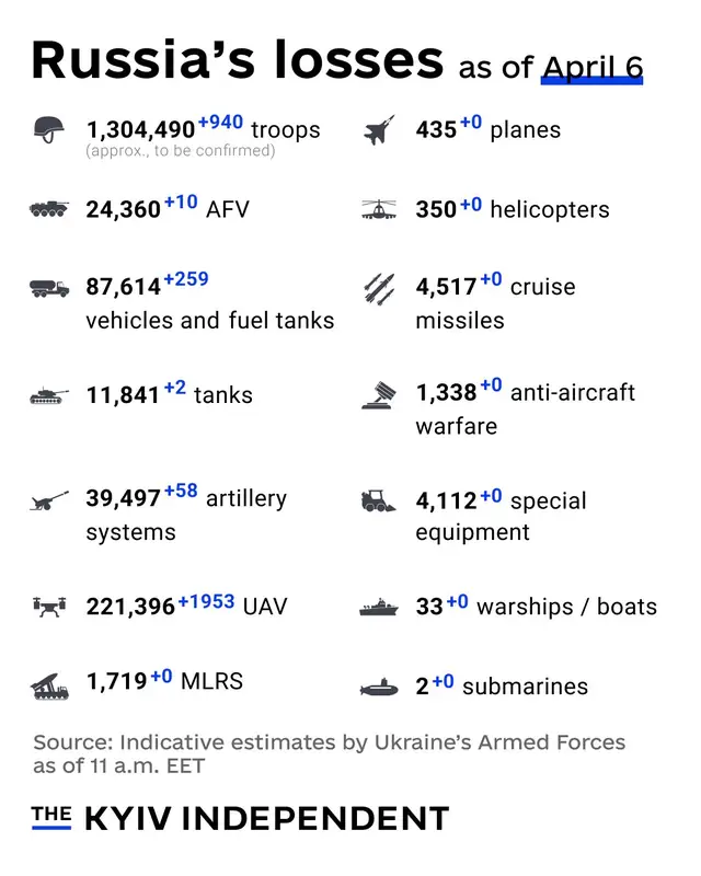Генеральный штаб Вооруженных сил Украины обнародовал свежие ориентировочные оценки боевых потерь российской армии по состоянию на 6 апреля 2026 года. Сводка охватывает ключевые категории, включая личный состав, бронетехнику, артиллерийские системы и авиацию.