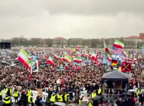 Республиканский сенатор Линдси Грэм принял участие в демонстрации в Мюнхене и размахивал флагом «Лев и солнце» — символом, с которым ассоциируется иранская оппозиция.