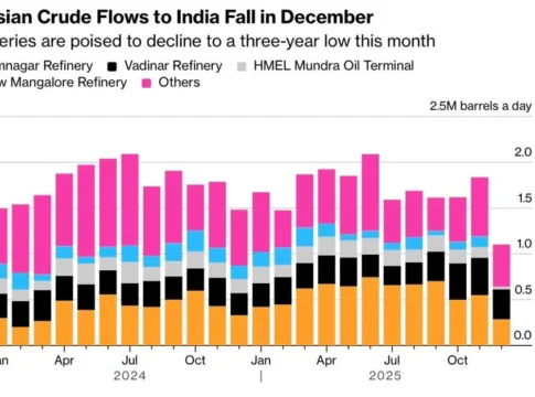 Индия в декабре 2025 года сократила закупки российской нефти до уровня, которого не наблюдалось с ноября 2022 года. По данным Bloomberg, суточный объём поставок составит примерно 1,1 миллиона баррелей.