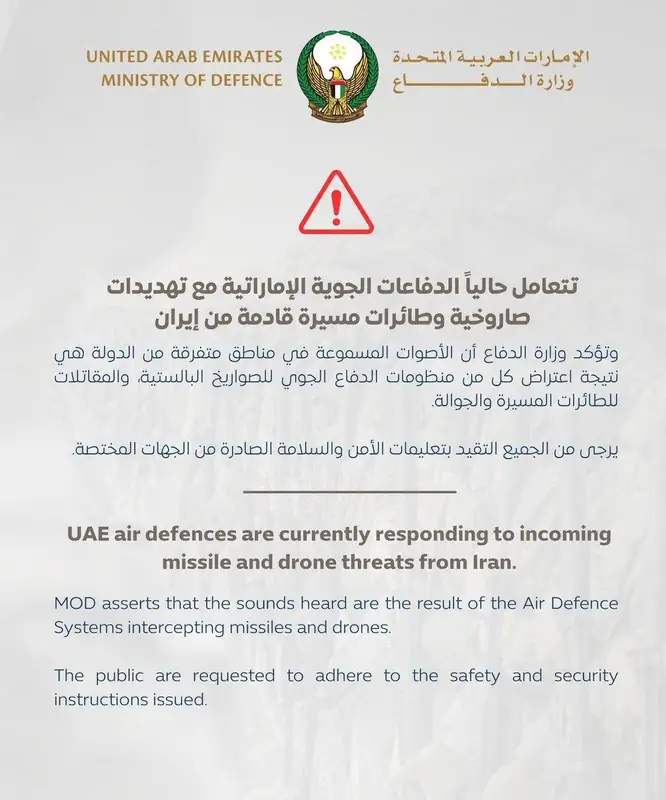 Местные жители сообщают о серии мощных разрывов в столице страны. Системы ПВО ОАЭ приведены в полную боевую готовность.