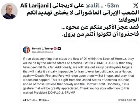 «Народ Ашуры Ирана не боится твоих пустых угроз. Более великие, чем ты, пытались уничтожить иранскую нацию и провалились. Осторожно, чтобы не исчезнуть ты сам», — заявил Лариджани.