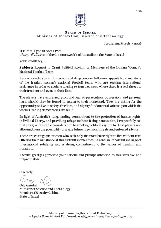 Министр инноваций, науки и технологий Израиля Гила Гамлиэль направила официальное письмо властям Австралии с просьбой предоставить политическое убежище членам женской национальной сборной Ирана по футболу.