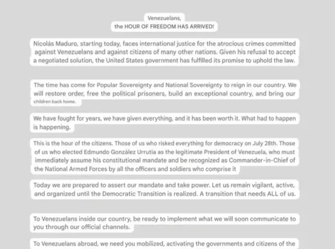 Венесуэльская оппозиционерка Мария Мачадо дала первую реакцию на отстранение президента Николаса Мадуро. «Наступил час свободы», — заявила она, комментируя происходящие в стране перемены.