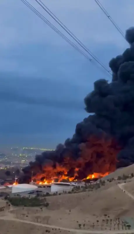 Мощный пожар вспыхнул на нефтебазе Шахран в северной части Тегерана после ночных авиаударов. Пламя охватило резервуары с нефтепродуктами, и спустя сутки огонь продолжает гореть с прежней интенсивностью.