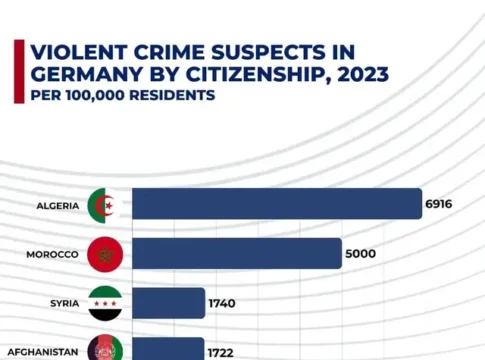 Федеральное ведомство уголовной полиции Германии (BKA) опубликовало статистику за 2023 год: лица без гражданства ФРГ составляют примерно 15% населения страны, но среди подозреваемых в насильственных преступлениях их доля достигает 40,7%.