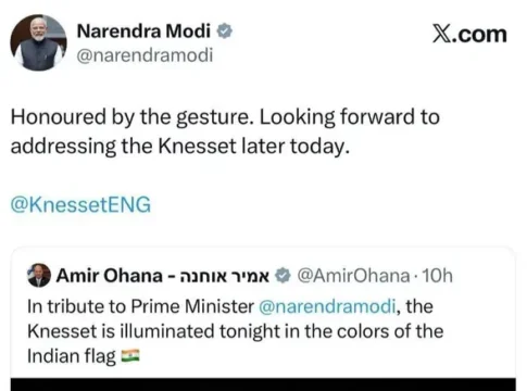 Премьер-министр Индии Нарендра Моди поблагодарил спикера Кнессета Амира Охану за подсветку здания парламента цветами флага Индии в честь его визита. Моди написал в X, что с нетерпением ждет выступления перед Кнессетом позднее сегодня.