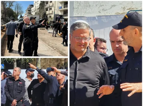 Комиссар полиции Израиля Дани Леви, командир округа Тель-Авив и комиссар пожарной службы представили министру национальной безопасности Итамару Бен-Гвиру оперативную сводку по ликвидации последствий ракетных ударов в районе Тель-Авива.