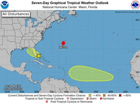 Прогноз Университета штата Колорадо на октябрь указывает на ‘несколько выше нормы активность’ в ближайшие две недели. Это связано с ураганом Имельда, который обрушился на Бермуды с ураганными ветрами ночью 30 сентября. Прогноз также указывает на потенциальное развитие штормов в центральной тропической Атлантике и северо-западной части Карибского моря и Мексиканского залива.