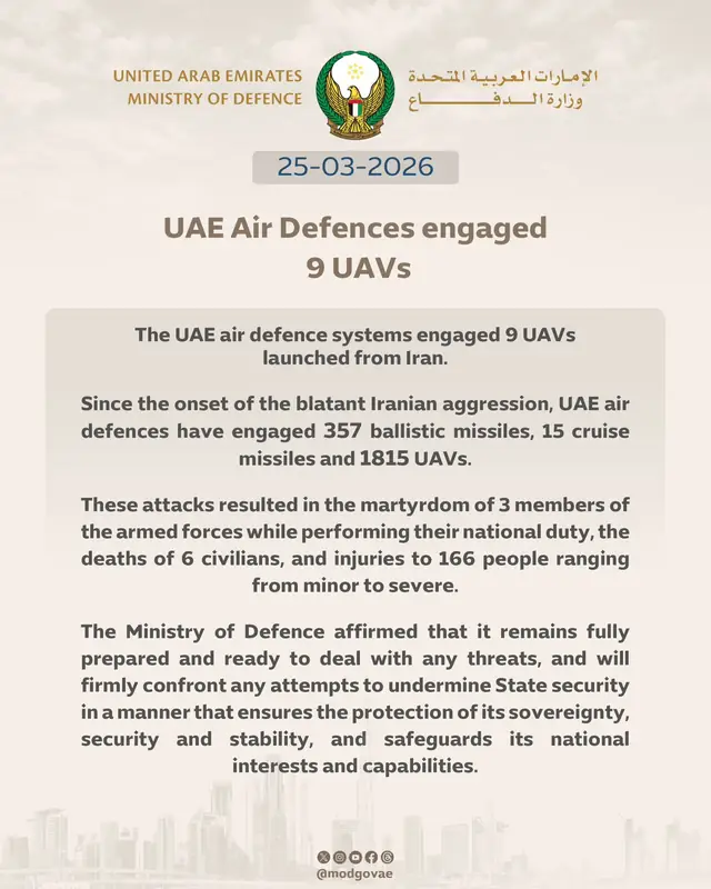 Войсками ПВО ОАЭ 25 марта 2026 года перезвачено 9 беспилотников, запущенных из Ирана. Об этом сообщило Министерство обороны ОАЭ.
