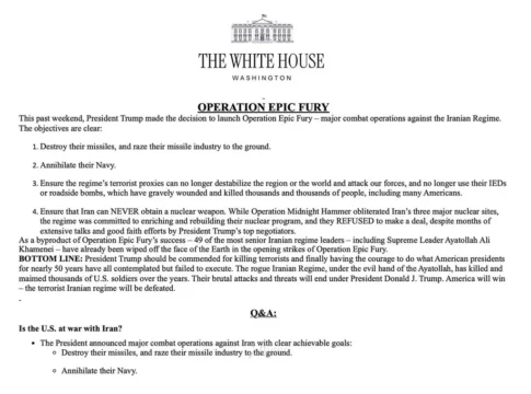 Вашингтон обнародовал цели операции «Epic Fury», которую официально называют «крупной боевой операцией», а не войной. Белый дом заявил о четырёх приоритетах: