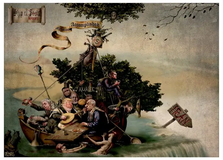 На рисунке законодатели сидят в лодке «Корабль неоконов», намекающей на картину Босха Корабль дураков. На мачте — мешок, испачканный кровью, на заднем фоне — слово «Амалек», библейский враг еврейского народа.