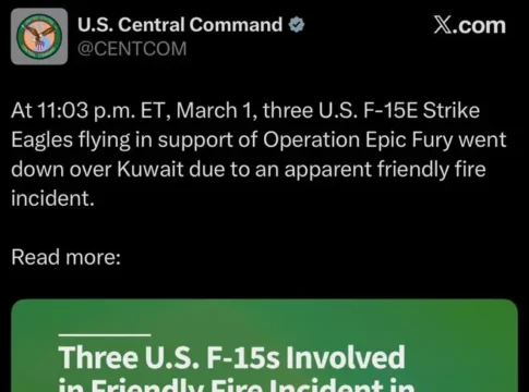 Командование центрального командования США (CENTCOM) сообщило о необычайном инциденте в небе над Кувейтом: три истребителя-бомбардировщика F-15E Strike Eagle были сбиты огнём своих же войск.
