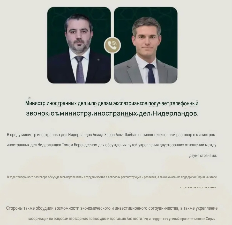 Министр иностранных дел Сирии Асаад аш-Шайбани провел телефонный разговор с главой МИД Нидерландов. Стороны обсудили развитие двусторонних отношений, поддержку усилий по восстановлению страны, экономическое сотрудничество и инвестиции, а также координацию по вопросам правосудия и поиска пропавших без вести.