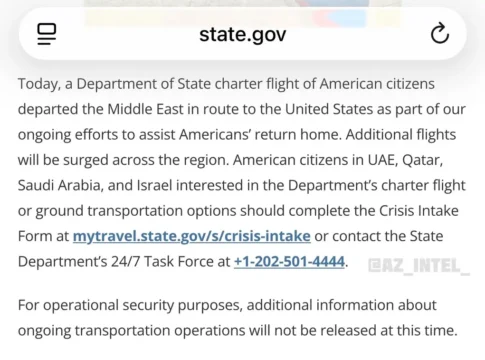 Государственный департамент США сообщил о вылете первого чартерного рейса с американскими гражданами, покидающими Ближний Восток. Самолёт направился в Соединённые Штаты в рамках масштабной операции по возвращению соотечественников домой.
