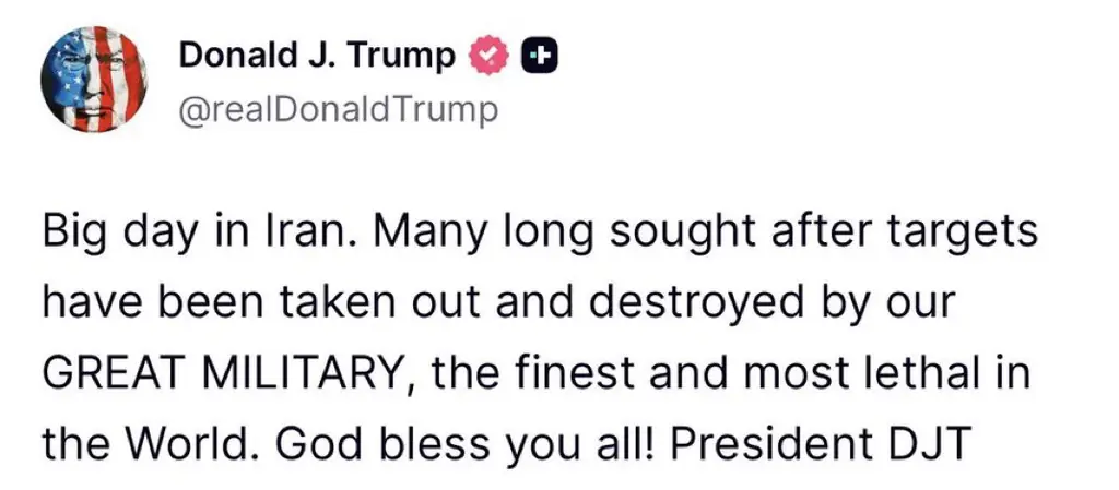 Президент США Дональд Трамп лаконично прокомментировал массированную авиационную атаку по объектам в Иране. «Большой день в Иране», — написал он в своём аккаунте в соцсети, не уточняя деталей операции.