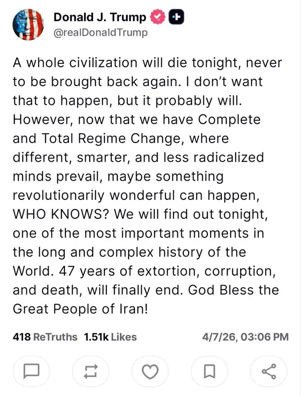 «Сегодня ночью погибнет целая цивилизация, и её уже никогда не возродят. Я не хочу, чтобы это случилось, но, вероятно, так и произойдёт. Однако, теперь, когда у нас произошла полная и тотальная смена режима, когда преобладают другие, более умные и менее радикальные умы, возможно, произойдёт нечто революционно прекрасное, КТО ЗНАЕТ? Мы узнаем это сегодня ночью, в один из важнейших моментов долгой и сложной истории мира. 47 лет вымогательства, коррупции и смерти наконец-то закончатся. Да благословит Бог великий народ Ирана! Дональд Трамп», — заявил Трамп.