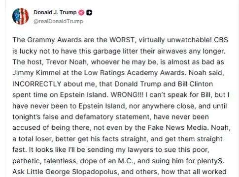 Президент США Дональд Трамп заявил, что подаст в суд на юмориста Тревора Ноя за его высказывания во время телетрансляции премии «Грэмми». Об этом Трамп сообщил в воскресенье, не уточнив сроков подачи иска и суммы компенсации.
