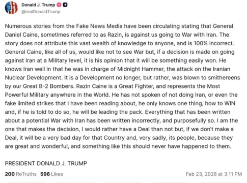 Президент США Дональд Трамп заявил, что предпочёл бы достичь соглашения, но пригрозил тяжёлыми последствиями в случае провала переговоров. «Если мы не заключим сделку, это станет очень плохим днём для этой страны и, к сожалению, для её народа, потому что они великолепны и замечательны, и подобное никогда не должно было с ними случаться», — сказал он.
