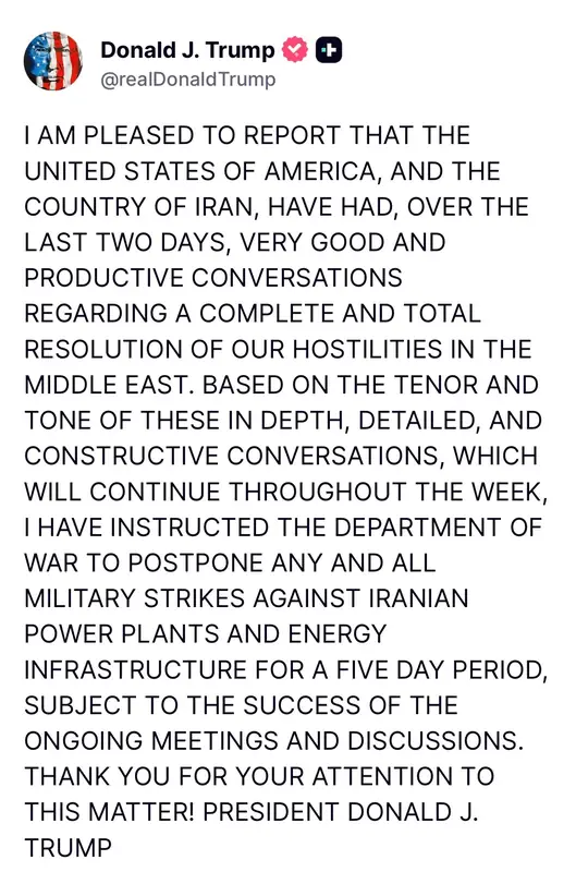 Президент США Дональд Трамп сообщил, что после «очень хороших и продуктивных» переговоров с иранскими представителями отдал приказ Министерству войны приостановить удары по объектам энергетики Ирана на пять дней.