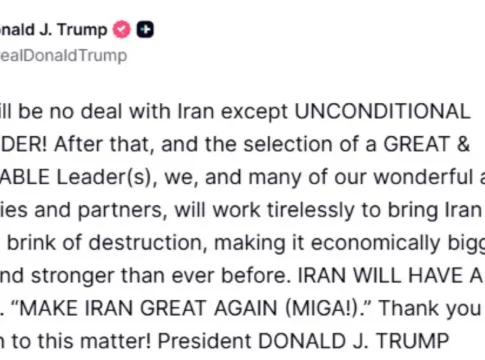 «С Ираном не будет никакой сделки, кроме безоговорочной капитуляции!» — написал глава Белого дома в своём сообщении.