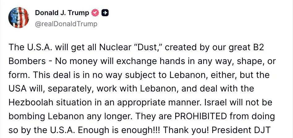 Президент Трамп подчеркнул, что США будут отдельно работать с Ливаном над решением проблемы «Хезболлы».