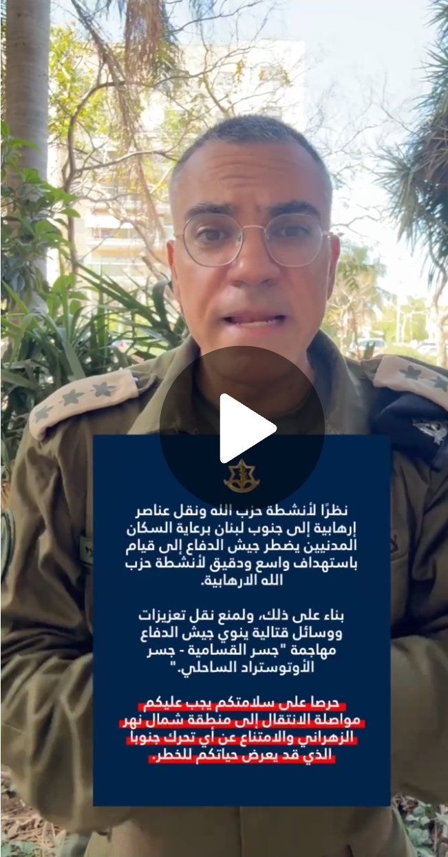 Представитель Армии обороны Израиля на арабском языке сообщил о готовящемся воздействии на мост аль-Касмия, пересекающий реку Литани в южной части Ливана. Объект расположен на прибрежной автомагистрале, соединяющей основные населённые пункты региона.