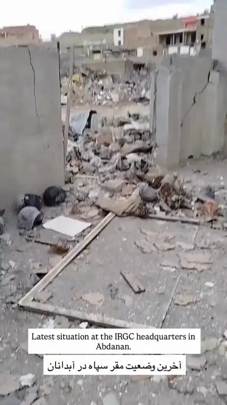 В городе Абданан на западе Ирана полностью разрушен штаб Иранского Корпуса гвардии (IRGC). Под завалами остались каски и военное снаряжение, что подтверждает военное назначение объекта.