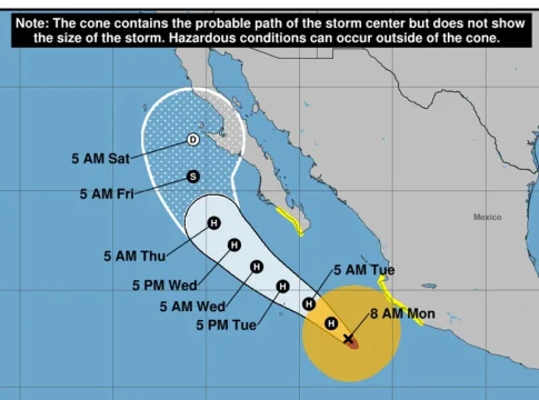 Ураган Присцилла продолжает усиливаться в Тихом океане и, по прогнозам, может достичь статуса мощного урагана в ближайшие дни. Об этом сообщает usatoday.com.Национальный центр ураганов сообщил в утреннем бюллетене в понедельник, 6 октября, что Присцилла находится примерно в 420 милях к юго-юго-востоку от южной оконечности полуострова Баха-Каліфорния с максимальными постоянными ветрами около 85 миль в час и более сильными порывами. Прогнозисты центра ураганов ожидают дальнейшего усиления перед началом ослабления к середине этой недели. Присцилла движется на северо-северо-запад, и это направление, вероятно, сохранится. Центр системы, как ожидается, будет двигаться параллельно побережью юго-западной Мексики и Баха-Каліфорния-Сур в начале-середине этой недели. Присцилла принесет сильные дожди – от 2 до 4 дюймов – на побережье штатов Мичоакан и западной части Герреро 6 октября. В Колиме, западной части Халиско и остальной части Герреро вдоль побережья ожидается от 1 до 3 дюймов осадков. Эти дожди представляют риск внезапных наводнений, предупредил центр ураганов. Кроме того, волны, вызванные Присциллой, затронут части побережья юго-западной и западно-центральной Мексики. Они могут достичь побережья южной части полуострова Баха-Каліфорния 6 октября. Эти волны, вероятно, вызовут опасные для жизни условия прибоя и течений, предупредили прогнозисты центра ураганов. Этот прогнозируемый путь показывает наиболее вероятное направление движения центра шторма. Он не иллюстрирует полную ширину шторма или его последствия, и центр шторма, вероятно, будет двигаться вне конуса до 33% времени.
