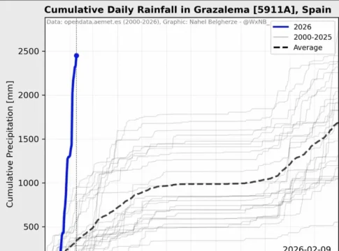 Город Грассалема в южной Испании переживает феноменальный сезон: за последние 20 дней здесь выпало около 2000 мм осадков, а с начала января сумма приблизилась к 2500 мм. По данным метеослужб, ливни продолжатся до конца текущей недели, а на следующей неделе к региону снова приблизится мощная система циклонов.