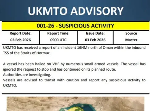 Британская организация по вопросам морской торговли (UKMTO) выпустила предупреждение Advisory 001/26 о подозрительной активности в Ормузском проливе.
