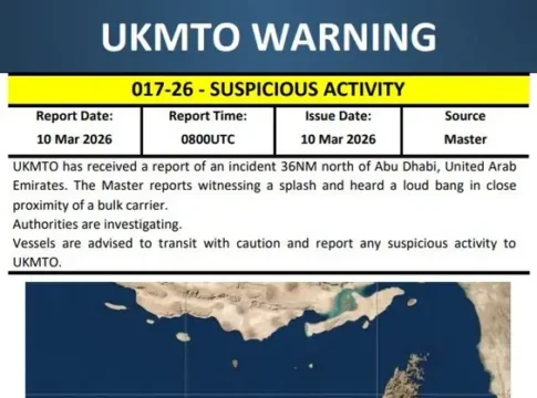 UKMTO сообщила об инциденте в 36 морских милях к северу от Абу-Даби. Капитан балкера увидел всплеск на воде и услышал громкий взрыв рядом с судном.