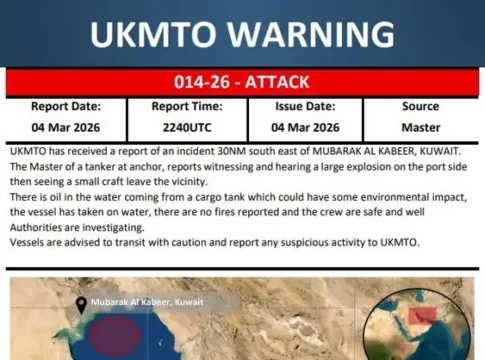 Британская морская торговая организация (UKMTO) сообщила о подозрительном инциденте в северо-западной части Персидского залива. Приблизительно в 30 морских милях к юго-востоку от нефтяной платформы Мубарак-аль-Кабир у побережья Кувейта на борту торгового судна прогремел мощный взрыв.