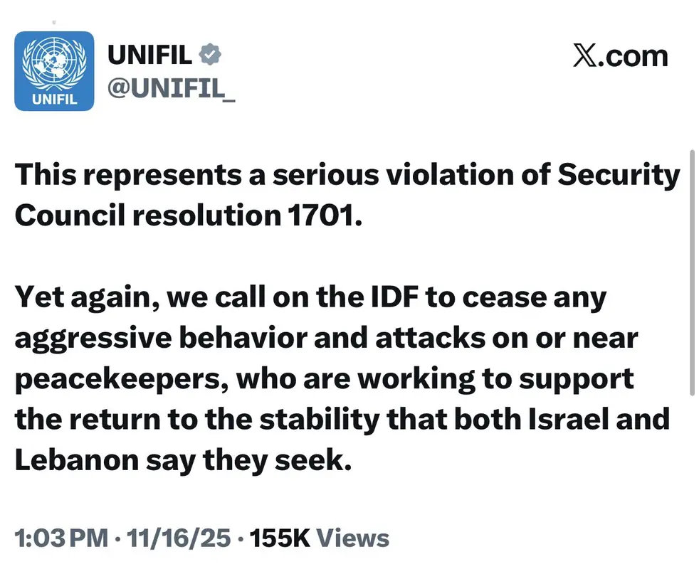 Международные наблюдатели изменили свою оценку инцидентов на ливанской границе. Если отчёты ЮНИФИЛ от 16 ноября, 26 января и 3 февраля 2026 года прямо указывали, что обстрел вёлся со стороны Израиля, то в документе от 30 марта 2026 года источник огня назван «неизвестным».